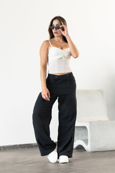 Confeccionado en lino rígido delgado, un tejido plano que mantiene una caída fluida y presencia sin transparencia, este pantalón es ideal para quienes buscan versatilidad y estilo.