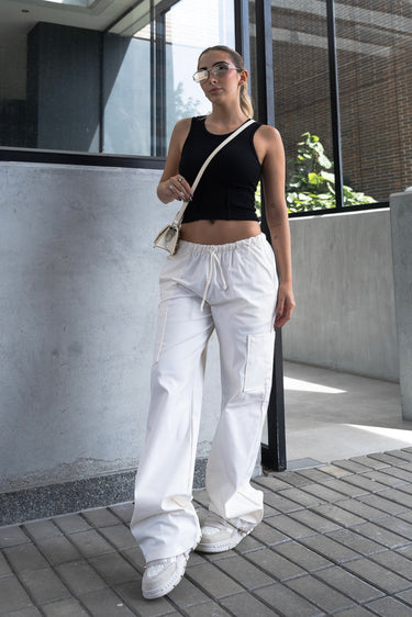 Pantalón tipo cargo con cordón de ajuste en bota y pretina, bolsillos delanteros, pretina resortada