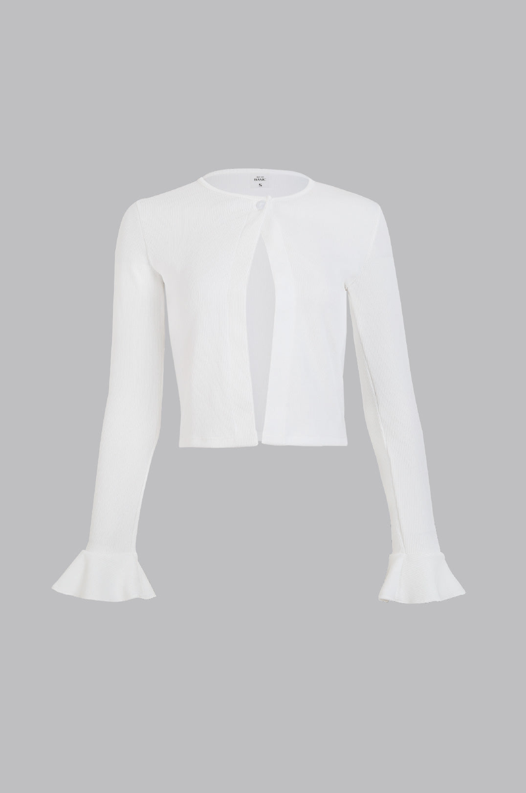 Confeccionada en un tejido acanalado de textura suave y elástica, esta blusa ofrece comodidad y un ajuste favorecedor que se adapta con naturalidad al cuerpo. Su acabado en tono blanco puro la convierte en un básico versátil que aporta frescura a cualquier look.